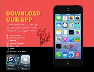 Download the 96.1 Jamz App to your mobile phone from your Google or Apple App Store!! Listen live at work & on the go!